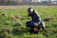 An einem sonnigen Herbsttag fuhren wir zu einer netten Züchterin, bei der eine Handvoll schokobrauner Welpen auf uns warteten. Dort angekommen hätte ich am Liebsten alle in den Kofferraum geladen. Die Welpen und auch ihre Mutter liefen freudig auf uns zu, begrüßten uns und waren dann wieder sehr beschäftigt mit wichtigen Aufgaben, die kleine Hunde beim Entdecken der Welt so haben. Ein dicker, tapsiger Welpe jedoch sammelte ein rotbraun gefärbtes Herbstblatt und setzte sich damit auf meinen Schoß. Ganz ruhig und bedächtig verbachte er dort einige Zeit und beschäftigte sich mit dem Blatt, während er sich von mir kraulen ließ. Da war er, der Funke. Die Entscheidung war gefallen und wir besuchten Fred regelmäßig, bis er dann im November bei uns einzog.
