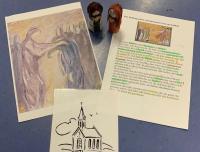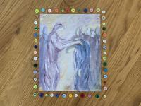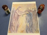 Nun könnt ihr z.B. das Aquarellbild von Jesus und der gekrümmten Frau in die Mitte legen und die Kinder fragen, was sie auf dem Bild sehen.