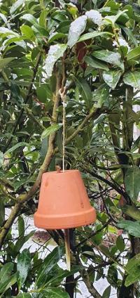 Und für die Futterglocke? - Blumentopf aus Ton - Ein längerer Holzstock, der aus dem Tontopf herausragt - Ein ca. 2 bis 4 cm langer Stock (für die Befestigung im Inneren des Blumentopfes) - Schnur Die Futterglocke Zuerst muss die Schnur durch das Loch am Boden des Topfes durchgefädelt werden. Das im Inneren des Topfes befindliche Ende der Schnur wird dann mit dem kleineren Stock fest verbunden. Das ist die Aufhängung. Und schon ist die Futterglocke fertig!