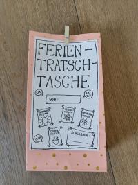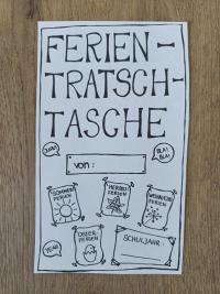 Die Ferientratschtasche ist eine bunt gestaltete Tasche oder Tüte in der während der Ferien, Erinnerungen gesammelt werden. Die abgebildete Vorlage ist so gestaltet, dass sie für alle Ferien genutzt werden kann. Dazu erhalten die Schülerinnen und Schüler am letzten Schultag eine Vorlage und malen das Feld mit den bevorstehenden Ferien aus. Anschließend kleben sie die Vorlage auf eine Tüte oder Tasche.