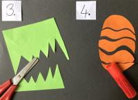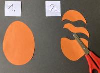 Anschließend durften die Kinder das Osterei in einzelne Teile zerschneiden. Dabei konnten sie sich selbst ein Muster ausdenken, z.B. Wellen oder Zacken. Es ist auch möglich, das Osterei senkrecht zu zerschneiden. Wichtig ist jedoch der Hinweis, dass die Kinder die Teile, die sie abschneiden, geordnet vor sich hinlegen. Denn für einige Schüler*innen erwies es sich als eine kleine Herausforderung, alle Teile auch wieder in der richtigen Reihenfolge aufzukleben.