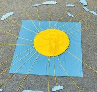In der Mitte liegt ein blaues Tuch. Darauf die Sonne. Wir sitzen im Kreis und ich fange an zu erzählen: „Manchmal erlebt man etwas und es fühlt sich so an, als ob die Sonne (in dir / für dich) scheint und es wird dir ganz warm ums Herz. Hast du so etwas schon mal erlebt?“ Dann darf jedes Kind einen Sonnenstrahl auffädeln, auch wenn man nichts dazu sagen möchte. Denn die Sonne scheint für jeden.
