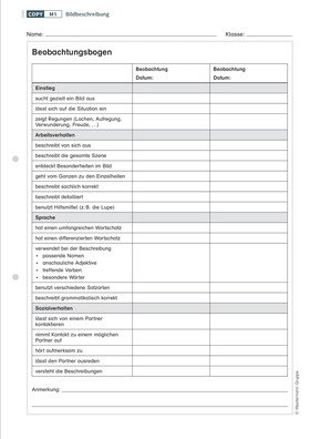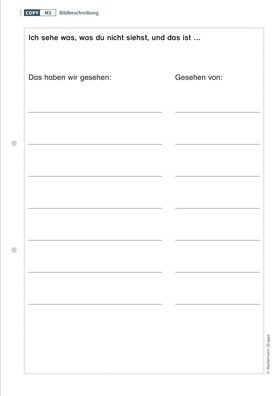 Detailreiche Bilder bieten im Anfangsunterricht die Möglichkeit, das Kind an das Beschreiben heranzuführen und gleichzeitig einen Einblick in seine Welt zu erlangen. Nach einer anfänglichen Bildbetrachtung mit der Lehrkraft arbeiten die Kinder in dieser Unterrichtseinheit in einem zweiten Schritt selbstständig mit den Bildern weiter, indem sie das ihnen bekannte Spiel „Ich sehe was, was du nicht siehst“ spielen. Detailreiche Wimmelbilder, die thematisch an die Lebenswelt des Kindes anknüpfen, eignen sich besonders gut, um mit Kindern das Beschreiben zu üben.