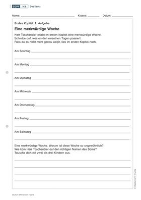 Die Kinder erkunden mithilfe der Aufgaben der Lerntheke das Kinderbuch „Eine Woche voller Samstage“ von Paul Maar. Die Aufgaben fördern die Lese- und Schreibkompetenzen, lassen aber auch Raum für den eigenständigen Umgang mit der Geschichte. Zu jedem Kapitel liegen Arbeitsblätter und Übungen bereit, die von den Kindern an der Lerntheke selbst gewählt und bearbeitet werden können.