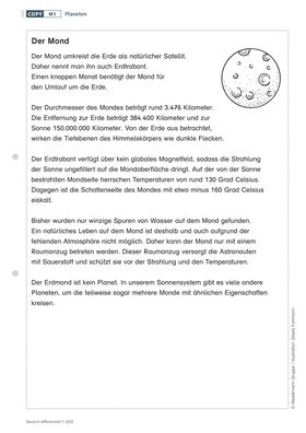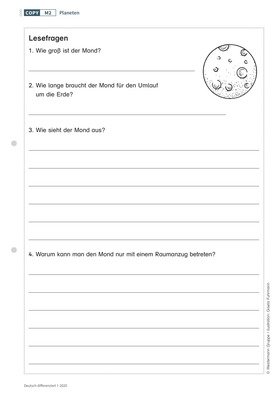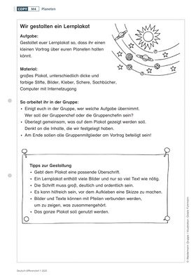 Nach dem gemeinsamen Lesen eines Sachtextes über den Mond suchen die Kinder selbstständig Texte und Bilder über die Planeten und erstellen in Gruppenarbeit ein Lernplakat. Die fertig ausgearbeitete Unterrichtseinheit für die vierte Klasse enthält den Sachtext zum Kopieren, Lesefragen zum Fördern des Leseverständnisses und Tipps zur Plakatgestaltung.