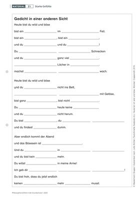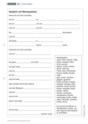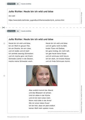 Die Gefühle Wut und Ärger werden in dem Gedicht „Heute bin ich wild und böse“ von Jutta Richter mit Bildern und Klängen vorgestellt, durchdacht und bearbeitet. In dem dreistrophigen Gedicht erzählt das lyrische Ich von seiner Wut, die es an Dingen und Personen auslässt. Die literarisch und musikalisch verdichtete Wut dient als Vorlage, über eigene, ähnliche Gefühle nachzudenken und selbst produktiv mit ihnen umzugehen.