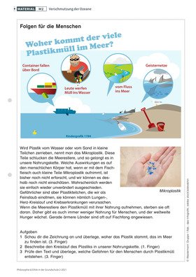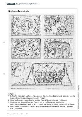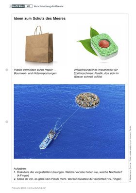 In dieser Unterrichtseinheit steht die Verantwortung des Menschen im Mittelpunkt, denn unsere Handlungen beeinflussen, was uns die Natur gibt und nimmt. Dafür gibt es zahlreiche Beispiele, wie u. a. der Kampf um die Vermeidung der Klimakatastrophe zeigt. Aber nicht nur die Luft, auch das Wasser ist gefährdet. Daher können die Kinder die Auswirkungen des Plastikmülls erkennen und sich Regeln erarbeiten, die auch ihnen die Möglichkeit eines konstruktiven Umgangs mit der Natur geben.