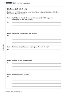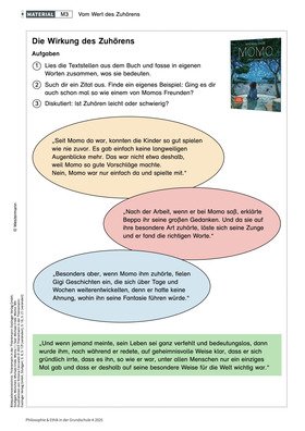 beflügelt die Fantasie der Menschen. Sie gibt ihnen Zeit, sich mit sich selbst und den Mitmenschen auseinanderzusetzen. Zuhören vertieft das (Mit-)Gefühl sich selbst sowie anderen gegenüber. Das Bilderbuch zu Michael Endes Jugendroman Momo regt zu Fragen an: Wodurch gelingt Kommunikation? Warum ist gerade das Zuhören Momos so besonders?