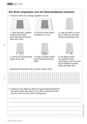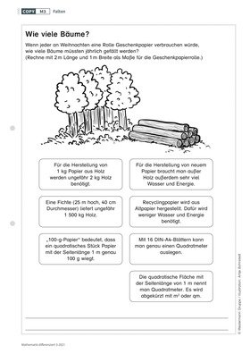 In der Unterrichtseinheit „Einpacken“ für die vierte Klasse geht es um die Bedarfsberechnung von Papier und Geschenkband bei unterschiedlich großen Päckchen. Die Fermi-Frage, wie viel Geschenkpapier in Deutschland zu Weihnachten verbraucht wird, führt anschließend zur Ideensammlung für die Herstellung von umweltverträglichen Verpackungen.