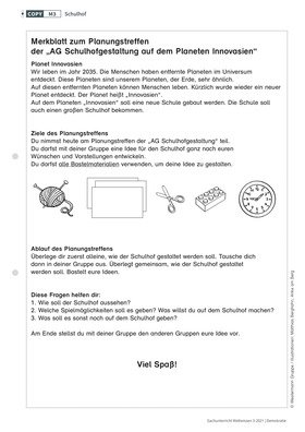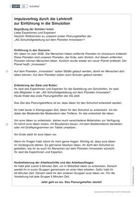 Die Innovativitätsfördernde Simulation (IfS) regt Schüler/-innen an, ihre Sicht auf die sie umgebende Lebenswelt zu schärfen, diese zu reflektieren und konkrete Gestaltungsideen zu entwickeln. Das kritische Nachdenken über bestehende Verhältnisse und das Artikulieren eigener Bedürfnisse stellen Grundvoraussetzungen für demokratisches und mündiges Handeln dar. In diesem Planspiel entwickeln die Schüler/-innen in kooperativen Aushandlungsprozessen und mittels vielfältiger Materialien in einem spielerischen Szenario Ideen zur Gestaltung eines Schulhofs auf dem Planeten „Innovasien“.